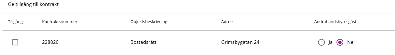 Välj vilket kontrakt användaren skall ha tillgång till, samt ifall användaren är andrahandshyresgäst eller inte.